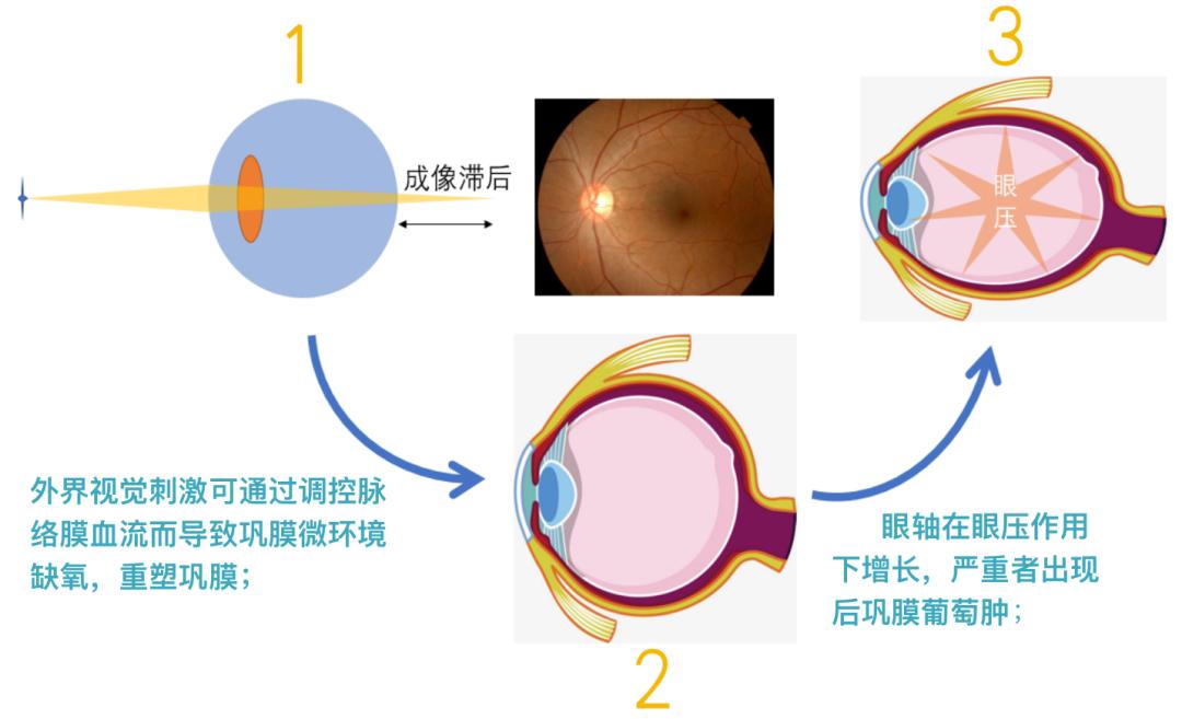 成像滞后是刺激眼轴发展的一个根本的初始动因,成像点在视网膜后,就会给眼球释放信号,这个信号会通过人体的一些机制,主要是脉络膜缺血变薄,使巩膜变薄,最后在眼压的作用下膨胀,实现眼轴的增长,这就是近视发展的机理。1