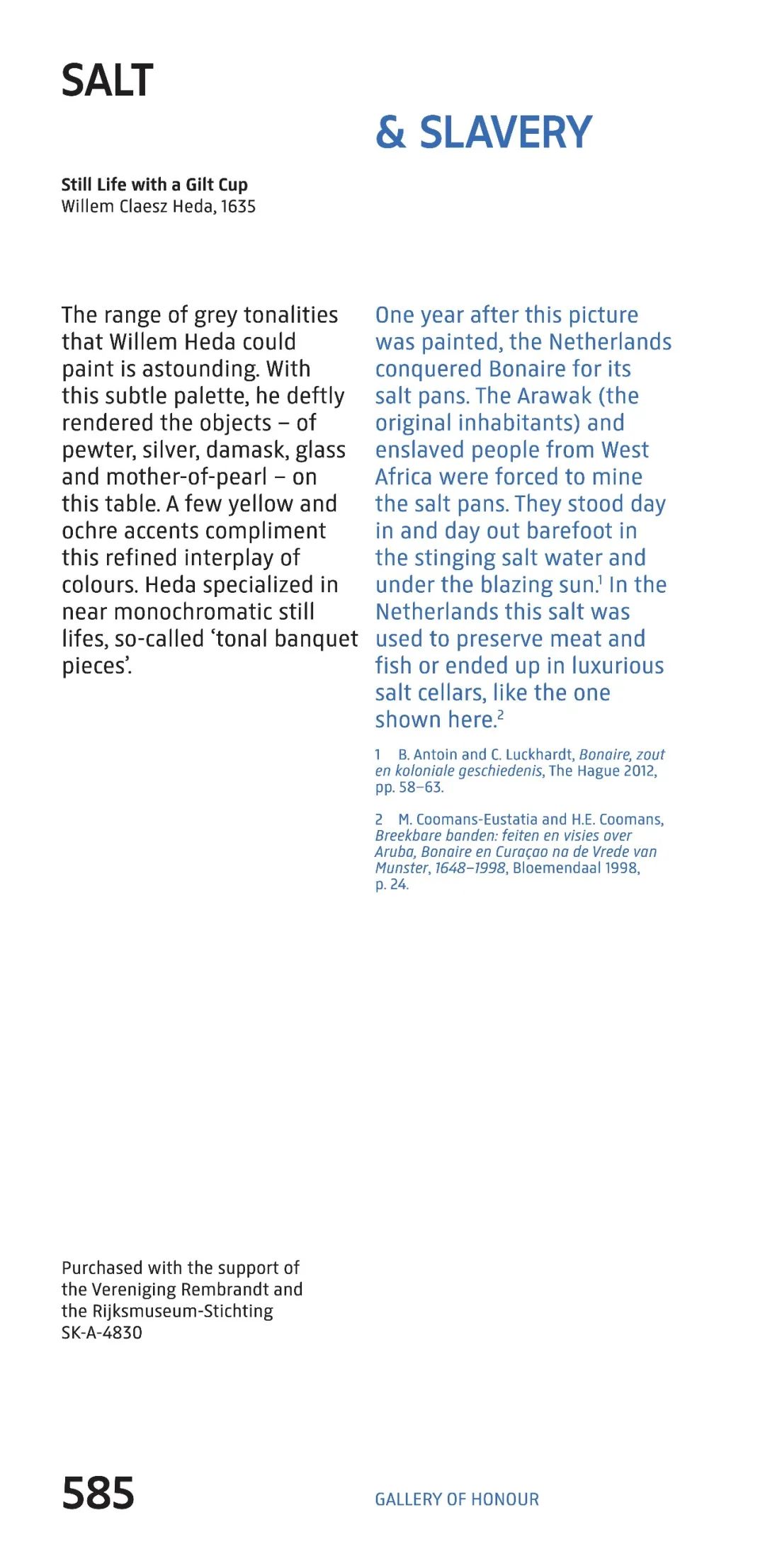 ◼ 展出在荷兰国立博物馆荣誉长廊中著名的《金杯静物画》。图片来源:Rijksmuseum◼ 为《金杯静物画》新增的标签。主要介绍了荷兰在殖民了波奈尔后,大批奴隶从西非被运到该地去开采盐田。