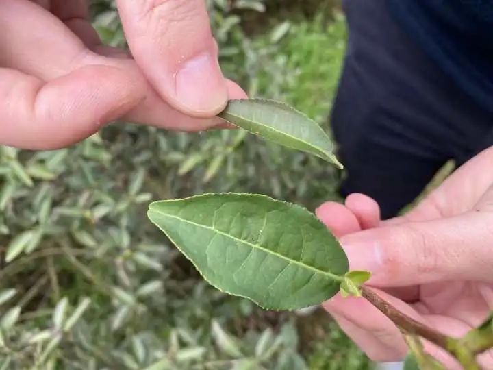 上叶为‘龙井瓜子’,下叶为‘龙井43’像大家比较熟悉的西湖‘龙井群体种’,‘龙井长叶’‘龙井圆叶’‘龙井瓜子’等姿态各异的茶树资源,还有所里选育的特早生茶树当家品种‘龙井43’的母树,都能在这里一站式鉴赏。