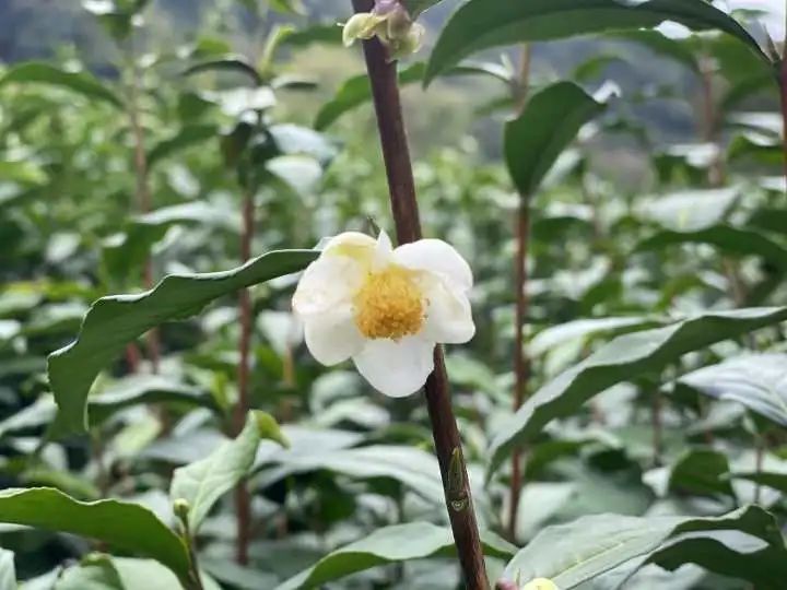 茶树在秋季开花,因为春茶单季产后修剪的原因,西湖边的茶园里春季偶尔也能看到花骨朵。