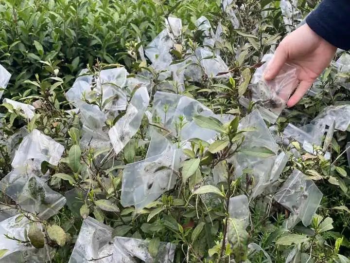所里的试验田,有很多枝头套着小袋子的茶树,这是正在做人工杂交育种的亲本。
