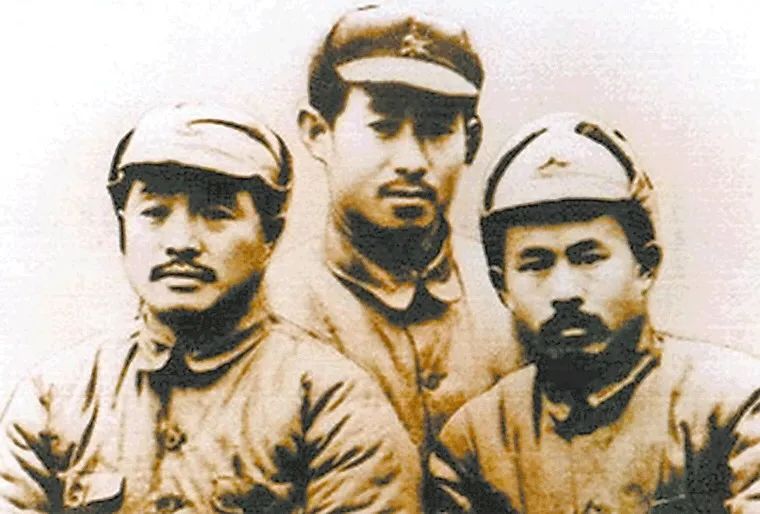 红军长征时期的贺龙(前排左)、任弼时(前排右)、关向应(后)资料照片1934年10月24日