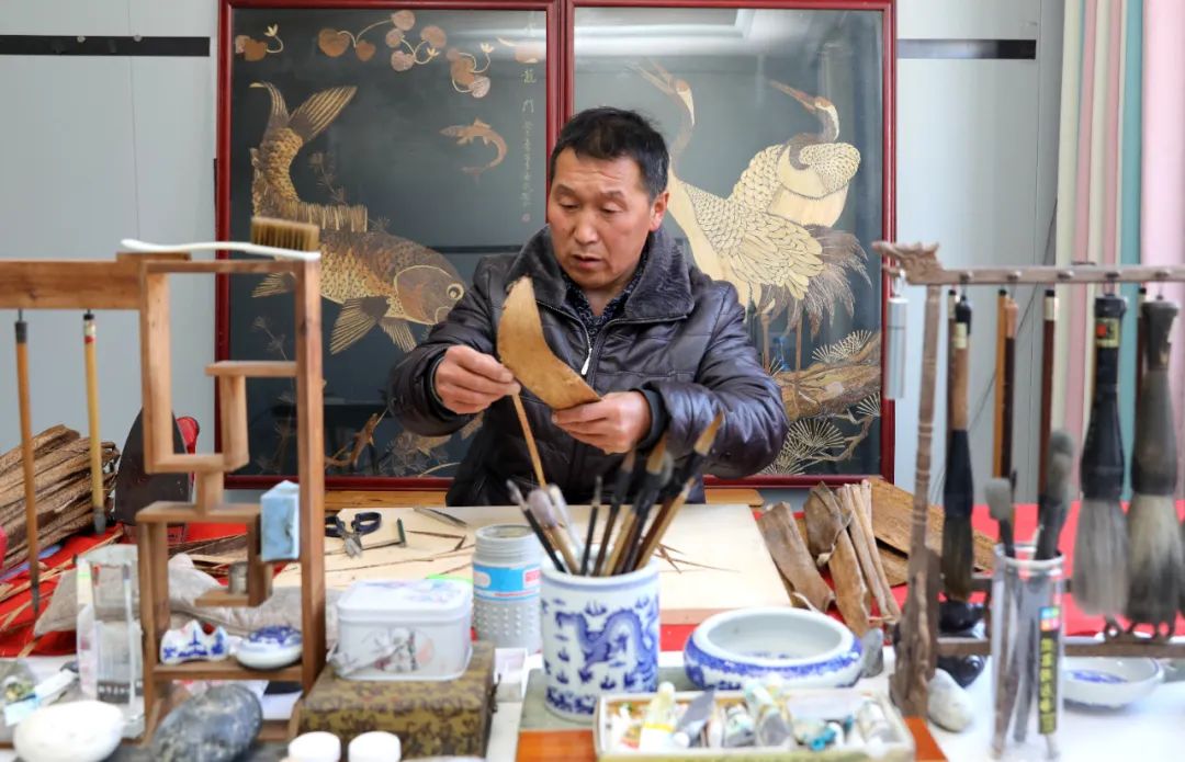 黄论武用笋壳创作的花鸟作品,充满朴素质感和浓浓乡土气息。黄论武今年56岁,创作笋壳画已近30年。中学毕业后,黄论武从麦秆画得到启发,开始尝试笋壳创作。他发现,相比麦秆,笋壳有着更加丰富的纹理和斑点,不同品种、不同季节的笋壳色彩差异明显,这让喜欢绘画的黄论武颇感兴趣,开始尝试一条独有的创作之路。