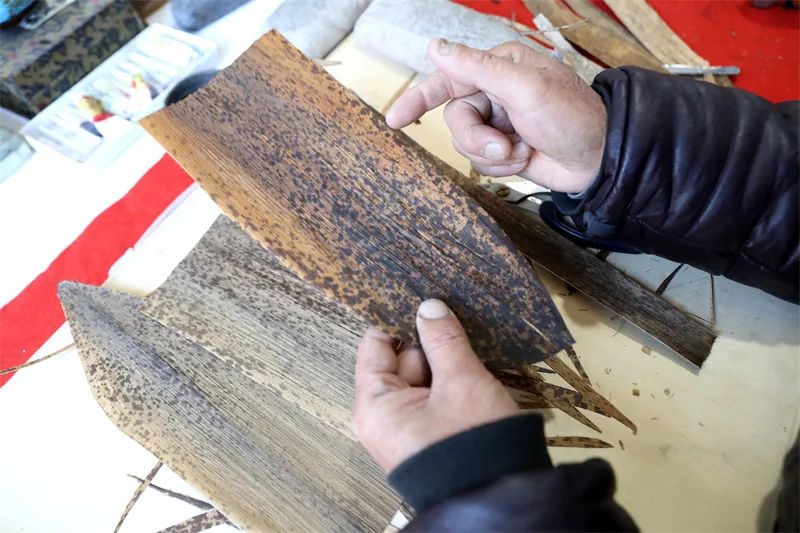根据创作需要,黄论武将笋壳裁剪成不同大小和形状,通过胶水粘贴到专用板材上。章村背靠浙北最高峰龙王山,地处黄浦江源,山川竹海,森林资源丰富。美丽的风景涵养了许多像黄论武这样心灵手巧的人,他们善于发现与利用大自然的馈赠,就地取材制作手工艺品,丰富传承地方文化。