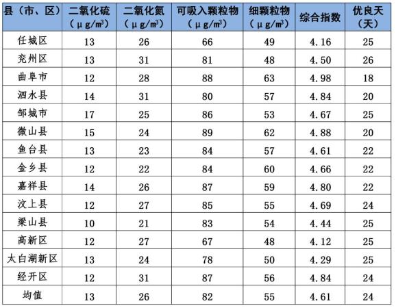 环境空气质量综合指数最好的县(市、区)是高新区,为4.12;最差的是曲阜市,为4.98;14县(市、区)同比改善幅度最大的是梁山县,改善幅度为13.1%,最小的是邹城市,为恶化2.4%。