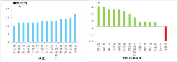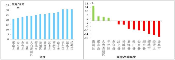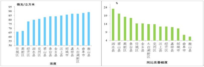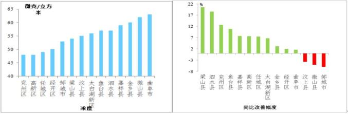 细颗粒物(PM2.5)浓度最低的县(市、区)是高新区和兖州区,均为48微克/立方米;最高的是曲阜市,为63微克/立方米;14县(市、区)同比改善幅度最大的是梁山县,改善幅度为20.6%,最小的是邹城市,为恶化6.0%。