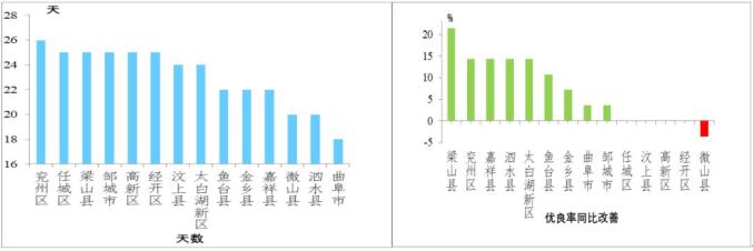 优良天最多的县(市、区)是兖州区,为26天;最少的是曲阜市,为18天;14县(市、区)优良率同比改善幅度最大的是梁山县,为提高21.4个百分点,最小的是微山县,为减少3.6个百分点。