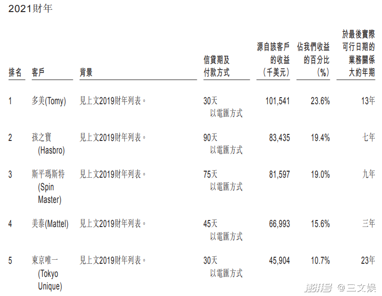 2021年,彩星玩具的最大客户贡献了30%的销售额,前五大客户占比75%;2021财年GFT来自多美、孩之宝和Spin Master的收入分别占总收入的23.6%、19.4%和19%。回顾:54人一年创收5亿元的彩星玩具