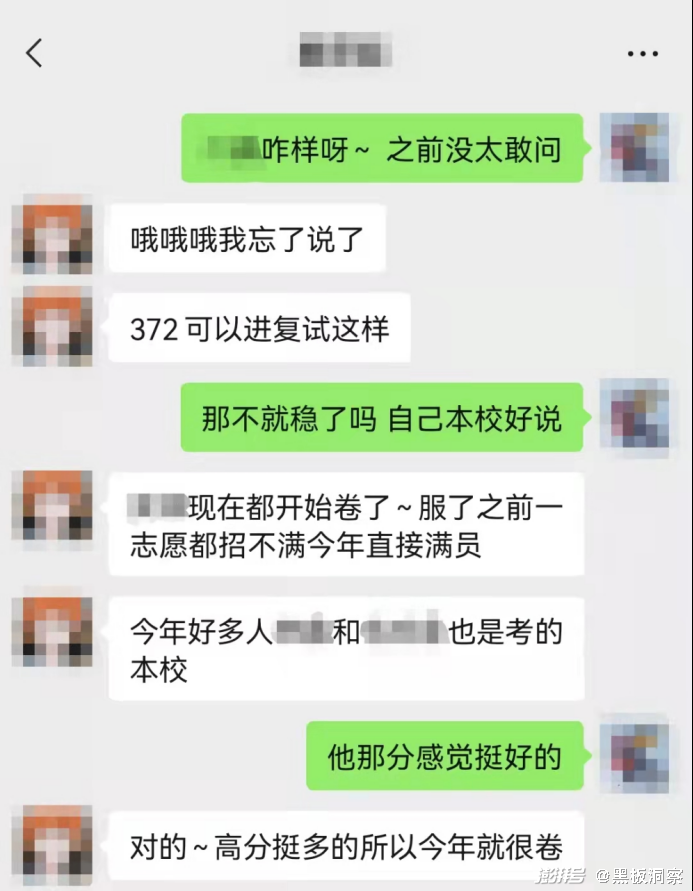 一位初试 370 多分的考生无奈表示,今年真是太卷了,之前学校志愿都招不满,今年直接满员。按往年来说,我的成绩在报考院校专业里应该算排名比较靠前的,复试压力也不大。而今年这个情况,虽然成绩可以进入复试,但心里确实没什么底,高分挺多的。