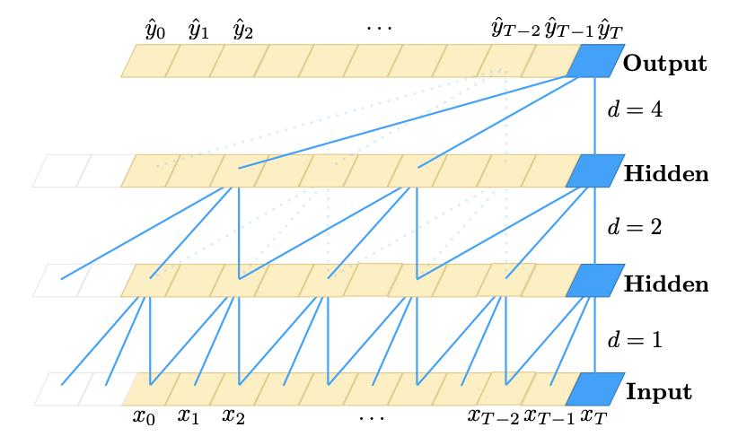 扩张卷积示意图,其中过滤器大小k = 3,扩张因子d = 1, 2, 4。感受野可以覆盖来自输入序列的所有数据点x_0...x_T。图源:https://arxiv.org/pdf/1803.01271.pdfTCN 的「秘密武器」是扩张卷积,如上图6所示。标准CNN 使用固定大小的内核/过滤器,因此它们只能覆盖邻近的数据元素。TCN使用扩张卷积,它们在不同长度的输入序列上使用填充(padding),从而能够检测彼此邻近但位置完全不同的item之间的依赖关系。
