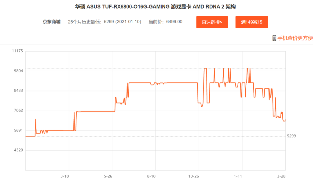 以某电商平台的两款显卡为例,这一款华硕的显卡尚未达到25个月最低点但已在价格低位。