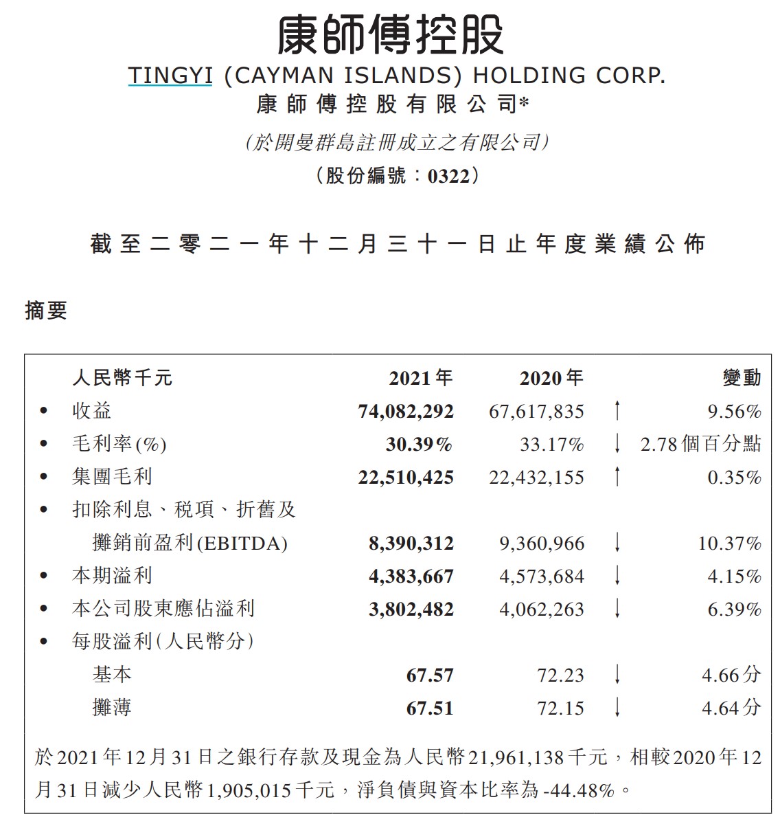 康师傅控股2021年业绩摘要