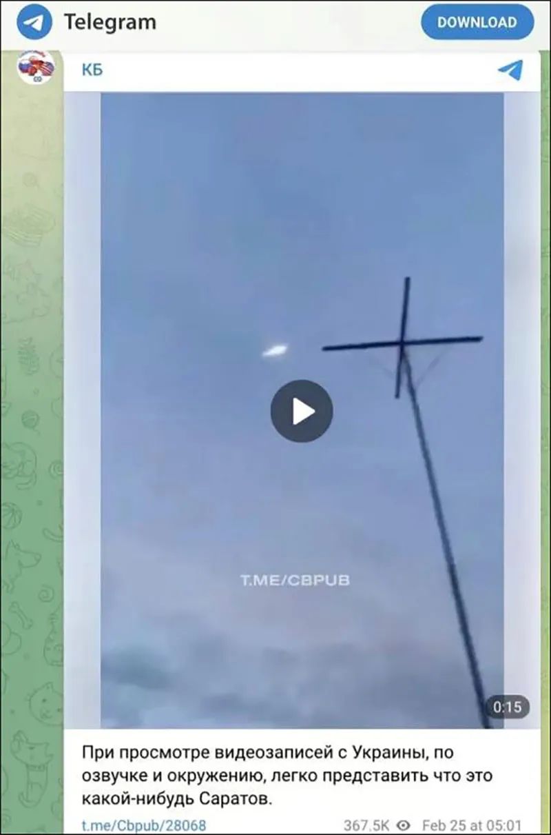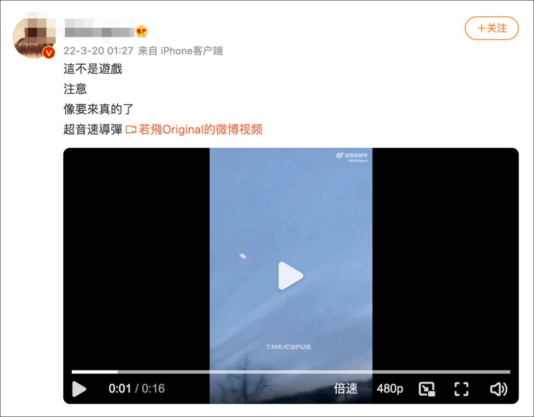 中文网络流传的被指俄罗斯高超音速导弹的视频,2月25日已经发布,早于俄罗斯3月19日宣布向乌克兰发射超高音速导弹,因此该画面不是高超音速导弹的画面。