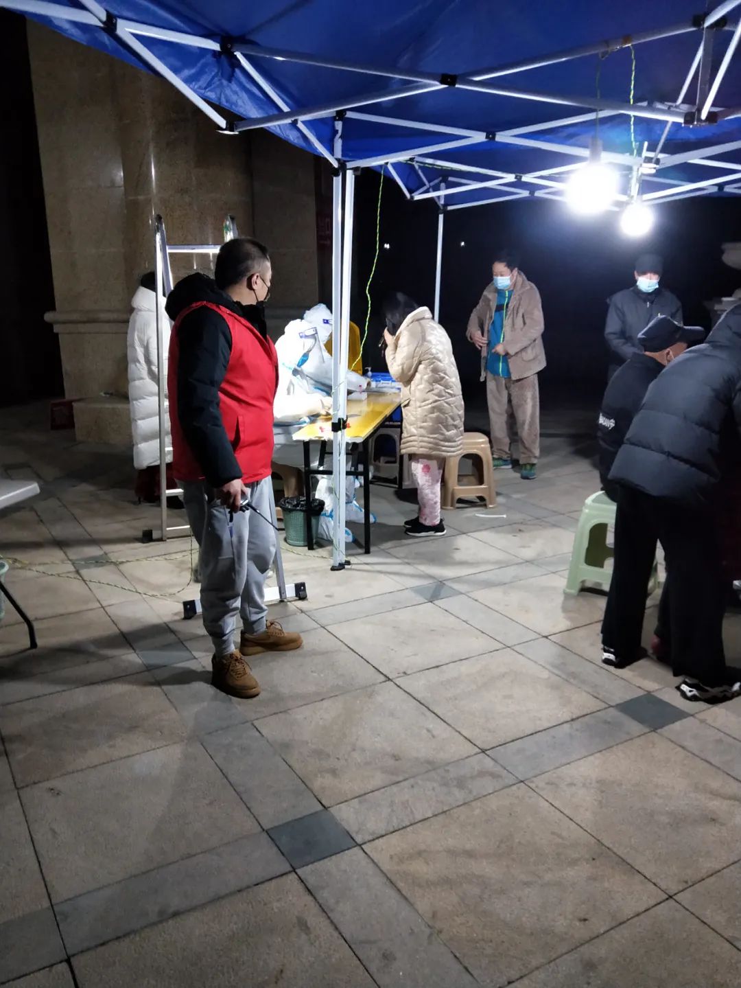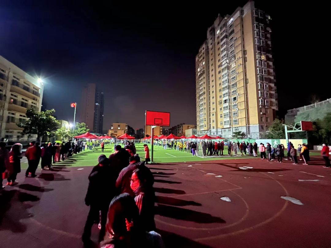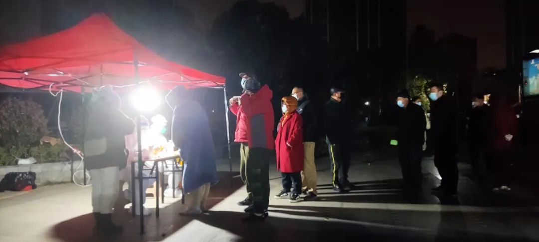 29日凌晨1点45分,和平街道天山社区小广场上,居民们参加核酸检测