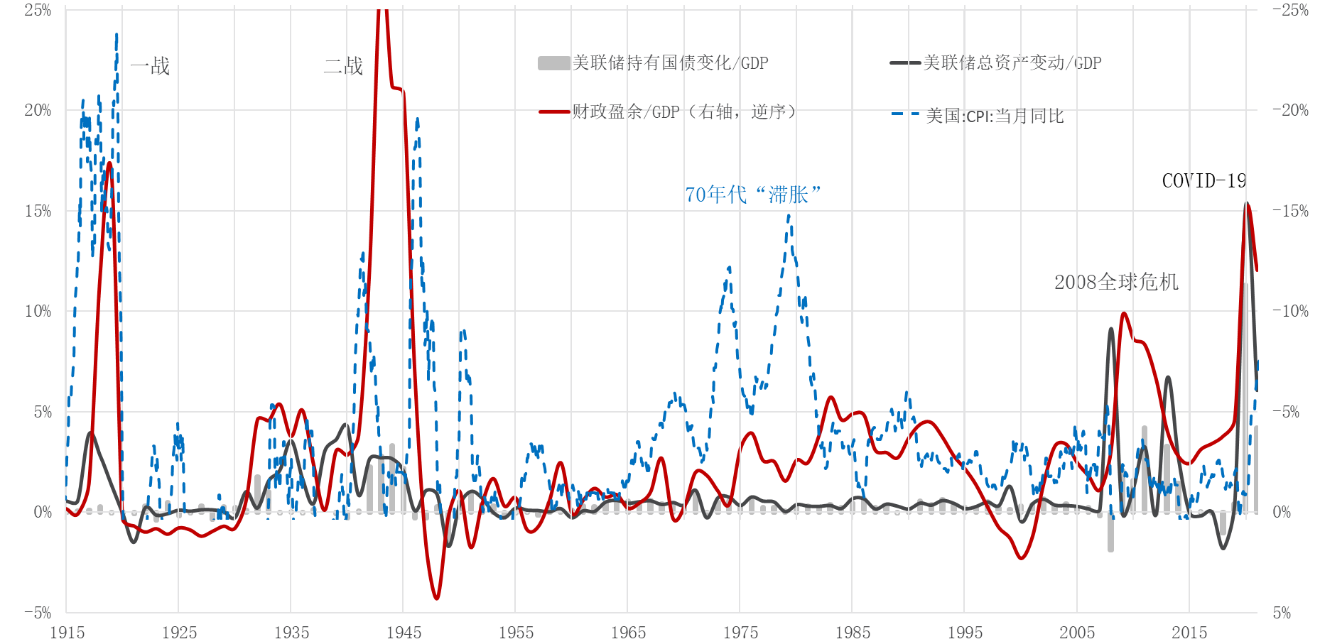 图1:美国联邦政府赤字率和美联储资产负债表扩张(美联储诞生以来)
