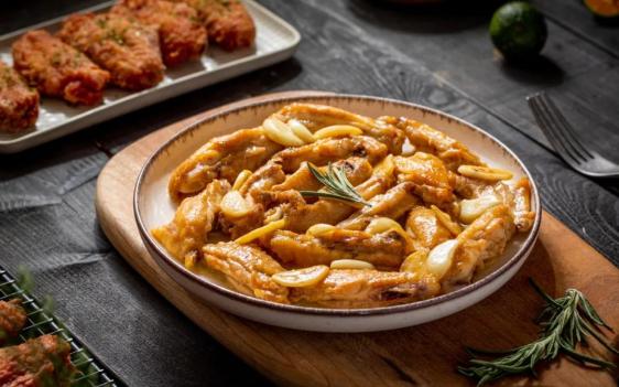 鸡中翅8个、黄油30g、蒜片20g、蚝油20g、生抽10g、鱼露10g、黄酒10g、糖5g、胡椒粉2g、木薯淀粉5g、油适量。