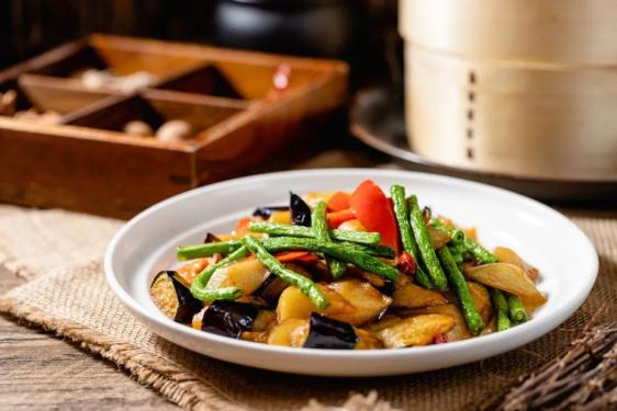 长茄子150g、土豆150g、豆角100g、蒜末20g、生抽20g、蚝油10g、糖5g、盐3g、干淀粉3g、水淀粉适量、油适量。
