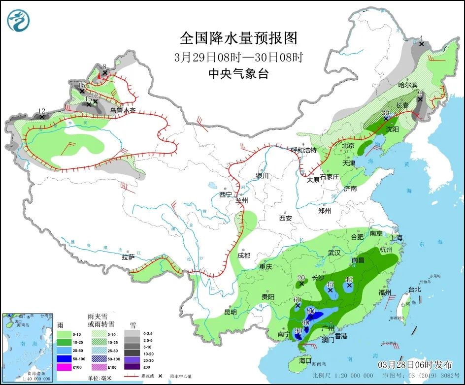 3月29日08时至30日08时,新疆北疆北部、伊犁河谷和南疆西部山区、内蒙古东南部、黑龙江中南部、吉林大部、辽宁北部、河北北部、北京西北部山区、西藏东南部等地部分地区有小到中雪或雨夹雪,其中,吉林东部、新疆伊犁河谷和南疆西部山区等地部分地区有大到暴雪(10~15毫米)。辽宁中西部、江南中南部、华南中北部等地部分地区有中到大雨,其中,广西东部、广东西部等地部分地区有暴雨(50~90毫米)。内蒙古西北部、黑龙江东北部、新疆沿天山地区和南疆盆地、青海西部和南部等地部分地区有4~6级风,其中,青海西部、新疆北疆北部部分地区有6~8级风。