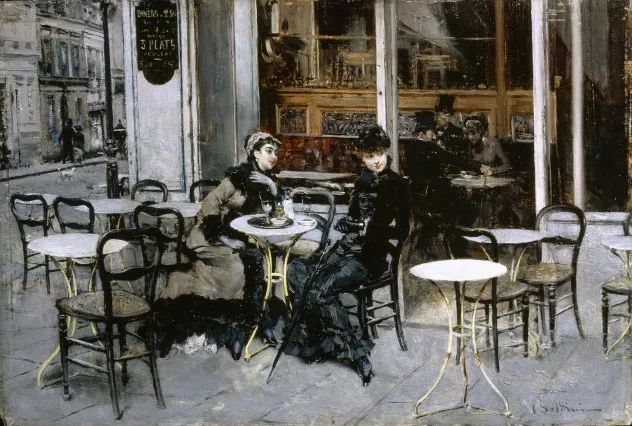 乔瓦尼·博尔迪尼《咖啡馆里的对话》G. Boldini, Conversation au café, 1879 Huile sur bois© Francesca Dini Archive, Florence