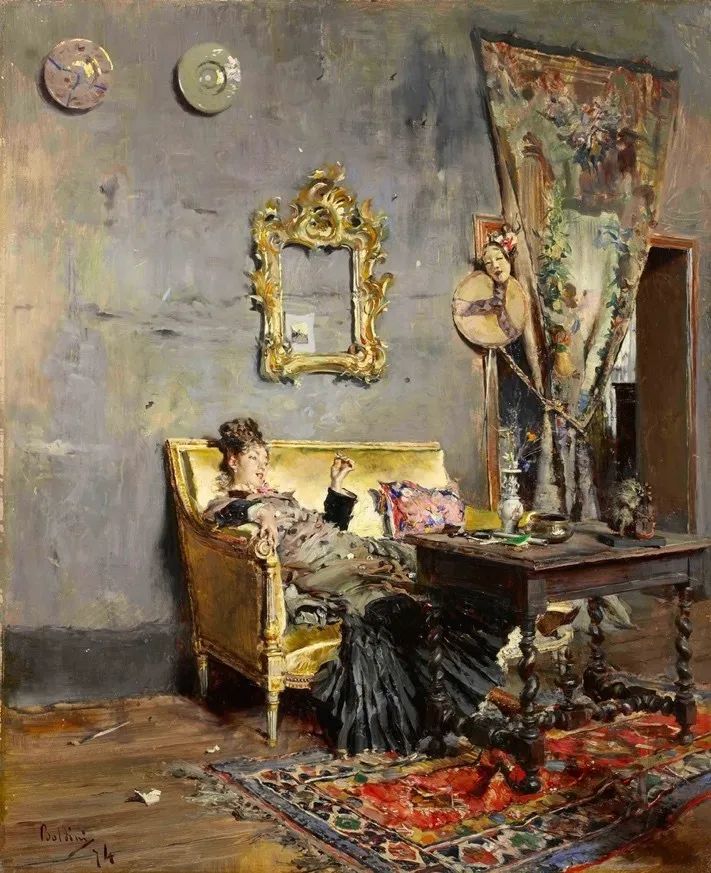 乔瓦尼·博尔迪尼《吸烟的贝尔特》G. Boldini, Berthe fumant, 1874 Huile sur bois, Collection particulière, courtesy Concezione Ltd