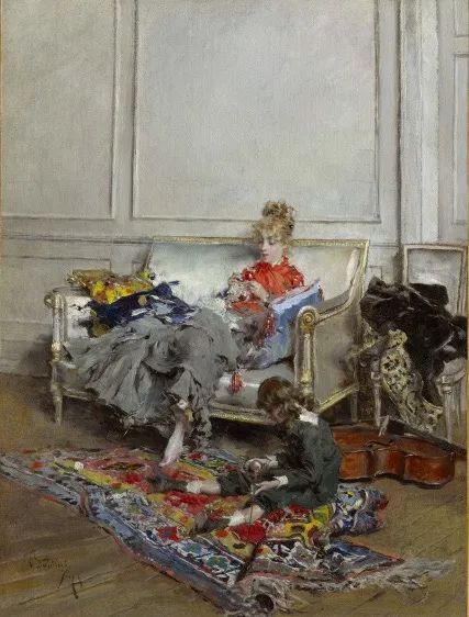 随着逐渐融入时尚而先进的大都市生活,博尔迪尼沉迷于绘制室内肖像画。我们能在他的画作中看到一些生活场景——正在做钩针活儿的贵妇人、抽着烟的女子,这些模特儿们在安静的室内坐着,摆出一个悠闲的姿势,却通过博尔迪尼的画笔烘托出了巴黎“美好时代”轻松欢乐的氛围。