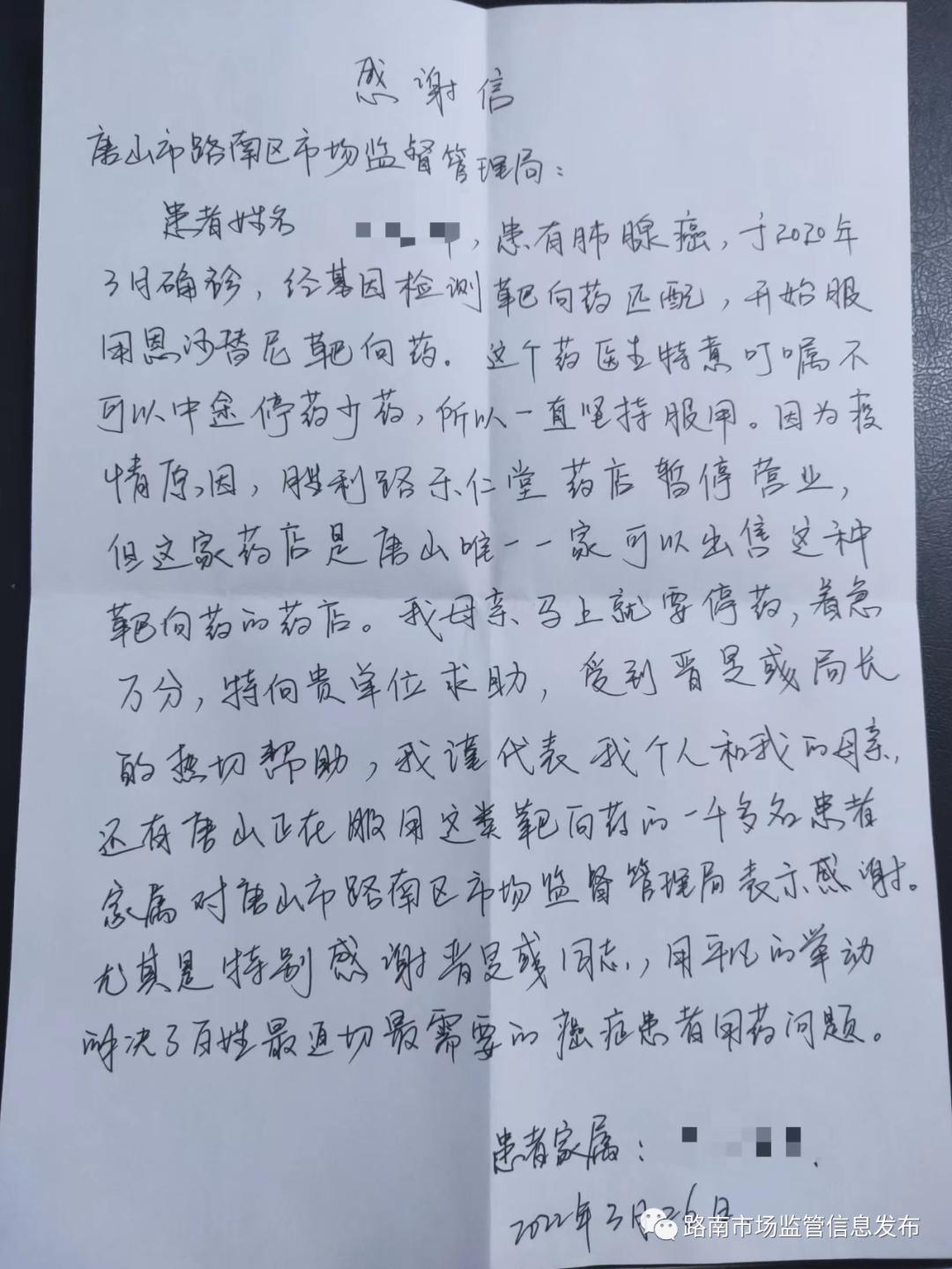 3月23日,路南区市场监督管理局接到群众反馈,家住路北区的某女士为肺腺癌患者,急需服用一种抗癌药品,该药品只有胜利路乐仁堂药店有售,但是该药店不属于保供单位,目前处于停业状态,店员也被封控在小区内,该女士及家属十分着急,称该药必须连续使用,否则会严重耽误病情,通过路南区市场监督管理局友谊分局、文北分局、药械科积极协调其他单位,保障了患者的用药需求。像这样的事例,还有很多,疫情防控封住的是病毒,却封不住人心!