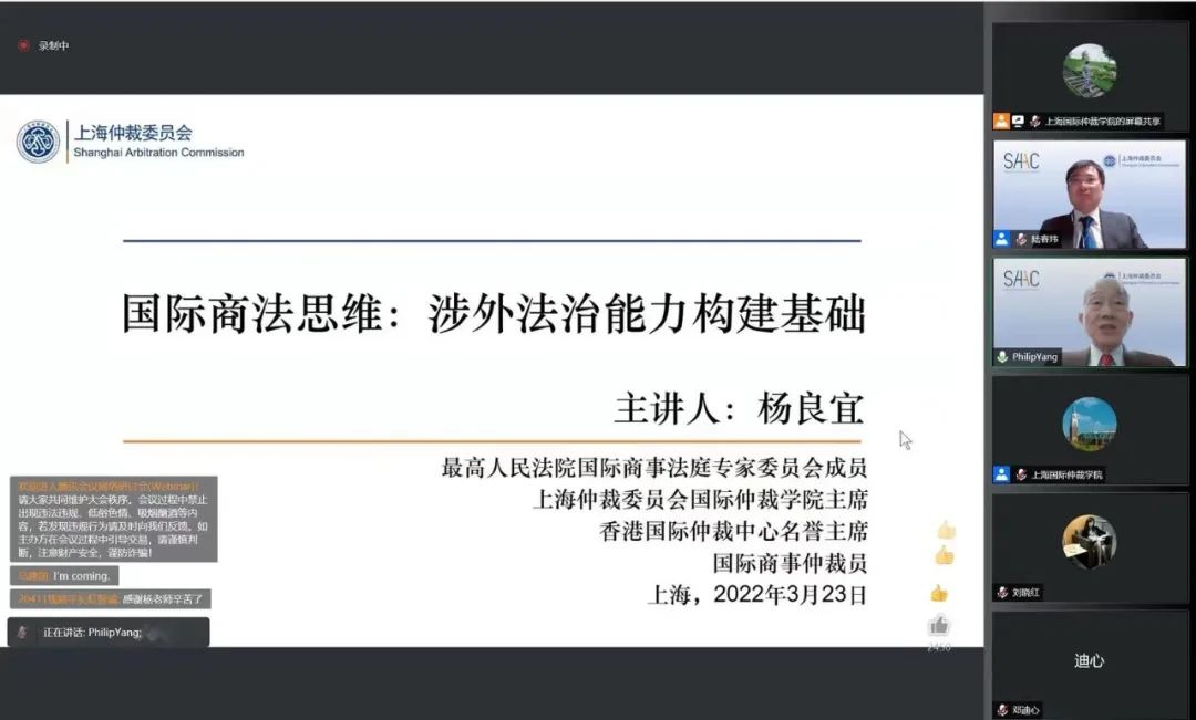 近日,上海仲裁委员会下设的学术机构之一——上海国际仲裁学院公开课第一讲开课。独立仲裁员、上海仲裁委员会新一届(第七届)委员会委员、上海国际仲裁学院主席杨良宜以《国际商法思维:涉外法治能力构建基础》为题,分享其在国际商事领域的实践及经验。