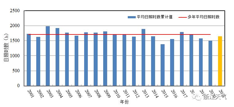浙江省近20年(2001~2020年)年平均日照时数总体呈波动下降的趋势,如图1所示。近20年日照时数最大值出现在2003年,为1978.0h,最小值出现在2015年,为1388.3h。2021年浙江省年平均日照时数为1644.2h,较近20年平均(1707.9h)偏少57.2h(3.3%)。