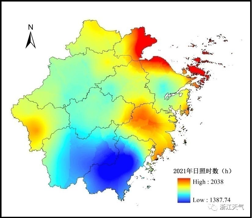 图 1 浙江省 2001~2021 年年平均日照时数年际变化2021年,浙江省年平均日照时数南北部差异较大,如图2所示。其中,嘉兴、舟山、宁波北部、台州一带年平均日照时数较高,最高可达2321.7h(平湖);丽水、温州一带年平均日照时数较低,最低为1163.2h(温州鹿城区)。