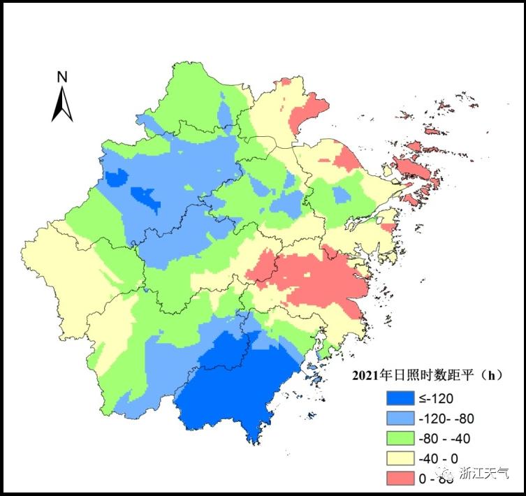 图 2 2021 年浙江省年平均日照时数空间分布从距平分布看,2021年浙江省年平均日照时数除浙中北沿海地区部分地区较近 20年平均偏高外,其余大部地区均较近 20 年平均偏低,温州大部、临安、建德等地较近20年平均值偏低120h以上,如图3所示。