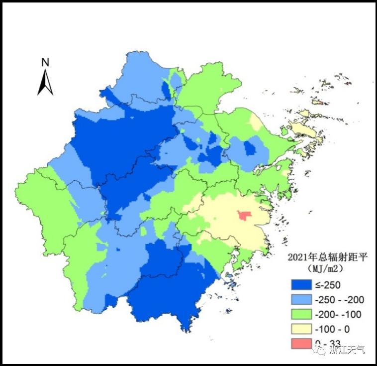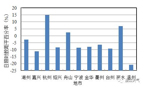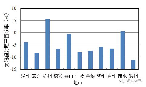 图8 2021年各地市太阳总辐射距平百分率原标题:《2021年浙江省太阳能资源年景公报》