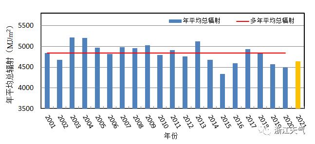 浙江省近20年(2001~2020年)的年平均总辐射量总体呈波动下降的趋势,如图5所示。近20年年平均总辐射量最大值出现在2003年,为5211.6MJ/m⊃2;,最小值出现在2015年,为4337.8MJ/m⊃2;。2021年浙江省年平均总辐射量为4642.3MJ/m⊃2;,较近20年平均值(4835.8MJ/m⊃2;)相比偏少193.5MJ/m⊃2;(4.0%),属辐射偏少年景。