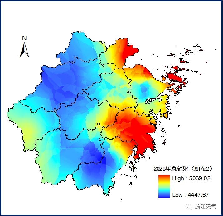 图5 浙江省2001~2021年水平面年平均辐射量年际变化2021年,浙江省太阳能资源区域性差异较大,如图6所示。其中嘉兴、舟山、宁波北部、台州一带年平均总辐射量较高,在4850~5530MJ/m⊃2;之间,浙西北及浙南地区年平均总辐射量较低,大部地区小于4500MJ/m⊃2;。