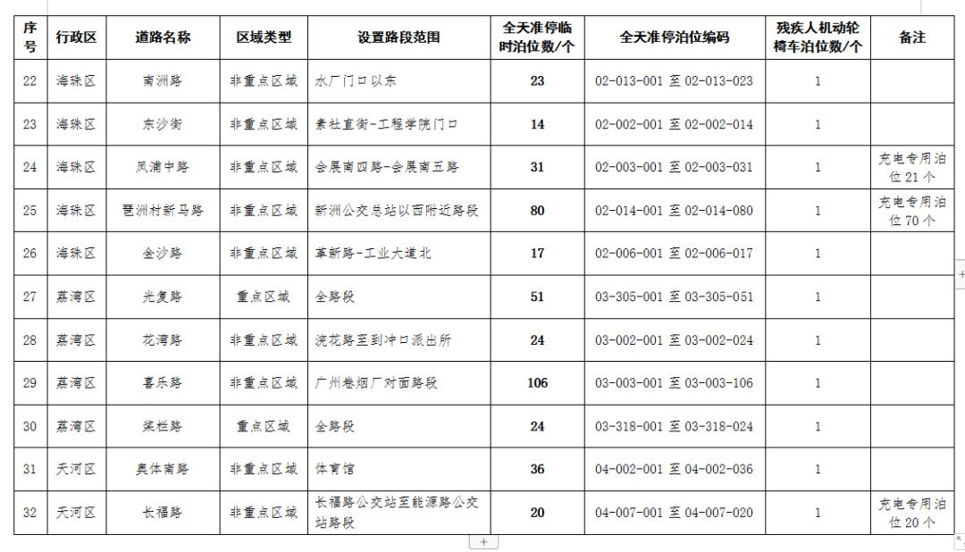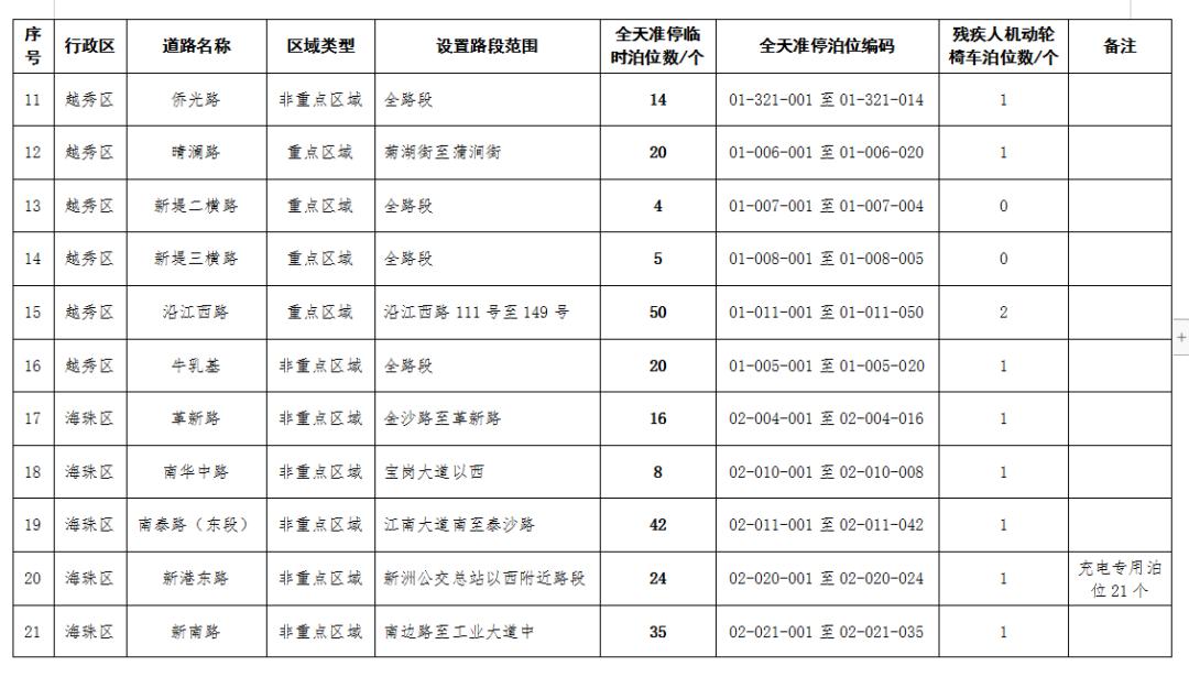 为进一步缓解新能源车临时充电问题,广州市道路事务中心精细化组织实施城市道路临时泊位标线更新工程,结合相关单位充电桩建设完成情况,把对应充电桩的临时泊位调整为“充电专用泊位”,在越秀区梅东路(36个)和海珠区凤浦中路(21个)、琶洲村新马路(70个)、新港东路(21个)及天河区长福路(20个)划设“充电专用泊位”共计168个,可满足市民群众不同的停车需求。