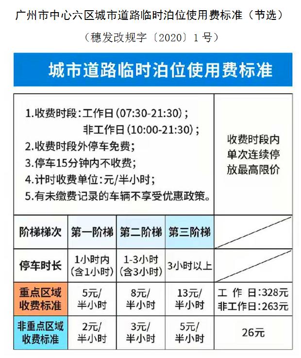 其中,越秀区长堤大马路、教育路和荔湾区光复路等12条城市道路临时泊位实施重点区域的收费标准,第1小时(含1小时)5元/半小时、第2、3小时(含3小时)8元/小时,第3小时以上13元/半小时,单次连续停放最高限价工作日328元/次(或者非工作日263元/次);越秀区梅东路、海珠区南泰路(东段)、荔湾区喜乐路、天河区长福路等20条城市道路临时泊位实施非重点区域收费标准,第1小时(含1小时)2元/半小时、第2、3小时(含3小时)3元/小时,第3小时以上5元/半小时,单次连续停放最高限价26元/次。