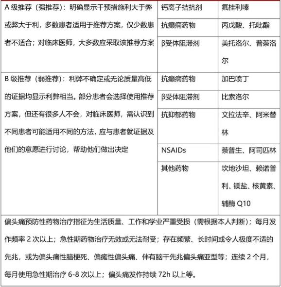 偏头痛预防性治疗药物A级推荐为氟桂利嗪、丙戊酸、托吡酯、美托洛尔、普萘洛尔,B级推荐为加巴喷丁、比索洛尔、阿米替林、萘普生、阿司匹林、坎地沙坦、赖诺普利、镁盐、核黄素、辅酶Q10。