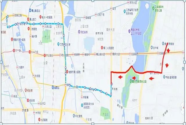 2、调整后线路走向:民营停车场—民丰路—艾溪湖北路—京东大道—南京东路—洪都大道—北京路—八一大道—孺子路—抚河路—洪城路;