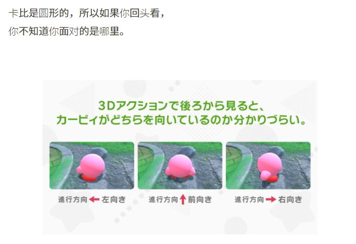 顺便说一句,卡比之所以一直没 3D 化,其实也是有原因的。根据任天堂开发者访谈表示,卡比的形象设计与 3D 表达不兼容,很容易让玩家无法判断方向,因为它太圆了。