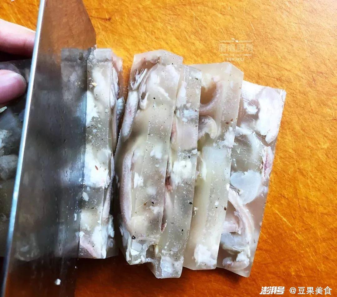 做法跟我们平时吃的鸡冻、鱼冻、猪皮冻非常相似,就是通过熬煮,使肉皮中含有的胶原蛋白溶于汤中,分解成明胶,冷却之后,就形成了皮冻。