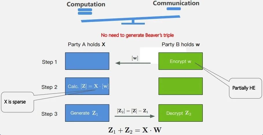 我们在推荐、营销、广告等工业场景中经常见到大量的数据,同时又非常稀疏。虽然学术圈有很多隐私机器学习方法,但如何将它们应用到大规模稀疏数据上是一个比较大的问题。为此,我们提出了一种名为 CAESAR(Secure Large Scale Sparse Logistic Regression)[8] 的方法,它会基于混合 MPC 协议,设计出大规模隐私保护 LR 算法。
