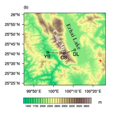 ▲苍山地区的地形高度,黑色圆点代表台站的位置(YB:漾濞站,CS:山顶站,DL:大理站)。 来源:中国气象科学研究院小尺度山地剖面气象观测网络建成后,研究人员发现,山顶站的降水频次约是西侧水平距离14公里外漾濞站(东侧水平距离9公里外大理站)降水频次的3.6倍(4倍),山顶站的降水量约为漾濞站(大理站)的2.7倍(2.6倍)。