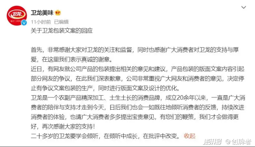 久而久之,大家对此已经到了深恶痛疾的地步,这也是为什么卫龙用了四、五年的包装会突然被骂上热搜的最主要原因,为此卫龙确实应该道歉。