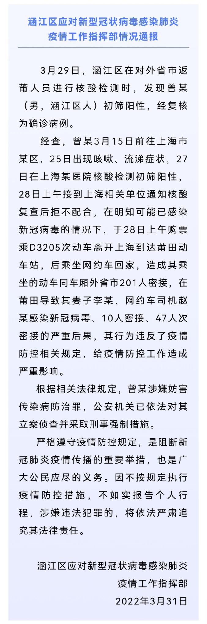 3月31日,福建省莆田市涵江区应对新冠肺炎疫情工作指挥部发布通报称,3月29日,涵江区在对外省市返莆人员进行核酸检测时,发现曾某(男,涵江区人)初筛阳性,经复核为确诊病例。