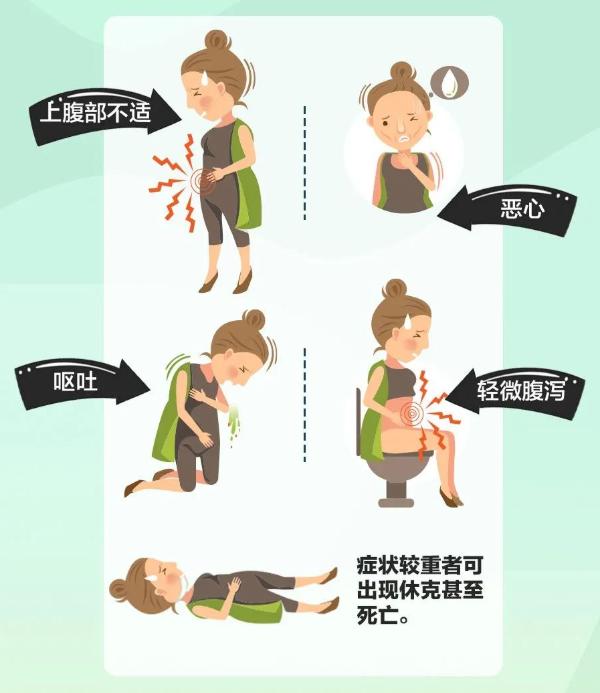 轻度症状:恶心、呕吐、腹泻、头晕、全身无力等;