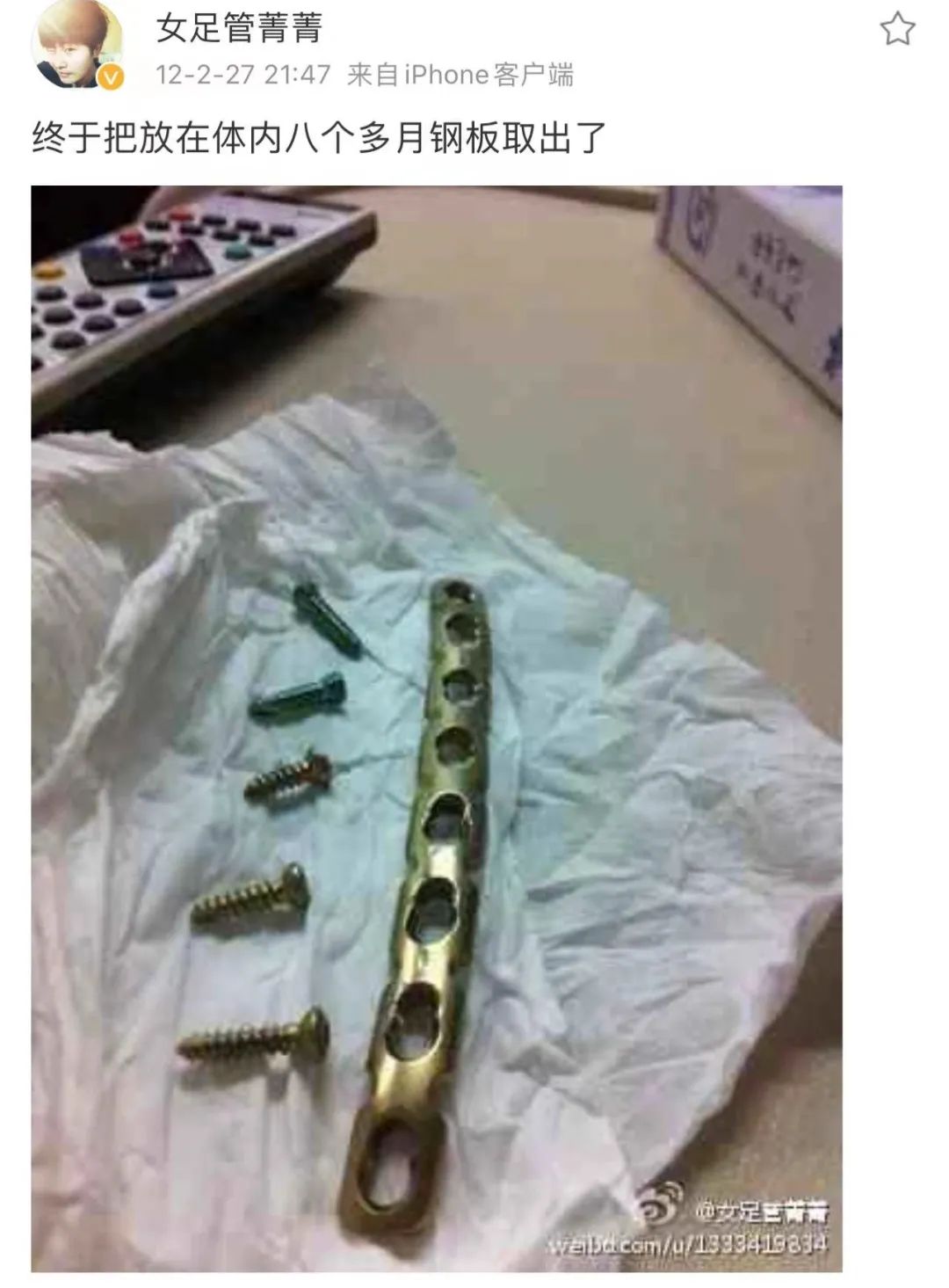 今年带领女足夺冠的水庆霞指导,93年在日本踢球时,不幸在一次队内教学赛里被铲倒,导致右腿胫骨严重骨折,手术时在腿上做了钢钉内固定此后她“带着”钢板继续为上海队、为国家队征战,直到2000年,也就是退役的前一年,她才将钢板取出。摘除时,由于在体内时间过久,医生用了最直接、最原始的手段,才把钢板敲出来。直到现在,每逢阴雨天或是运动量太大,她的腿依然会酸痛。