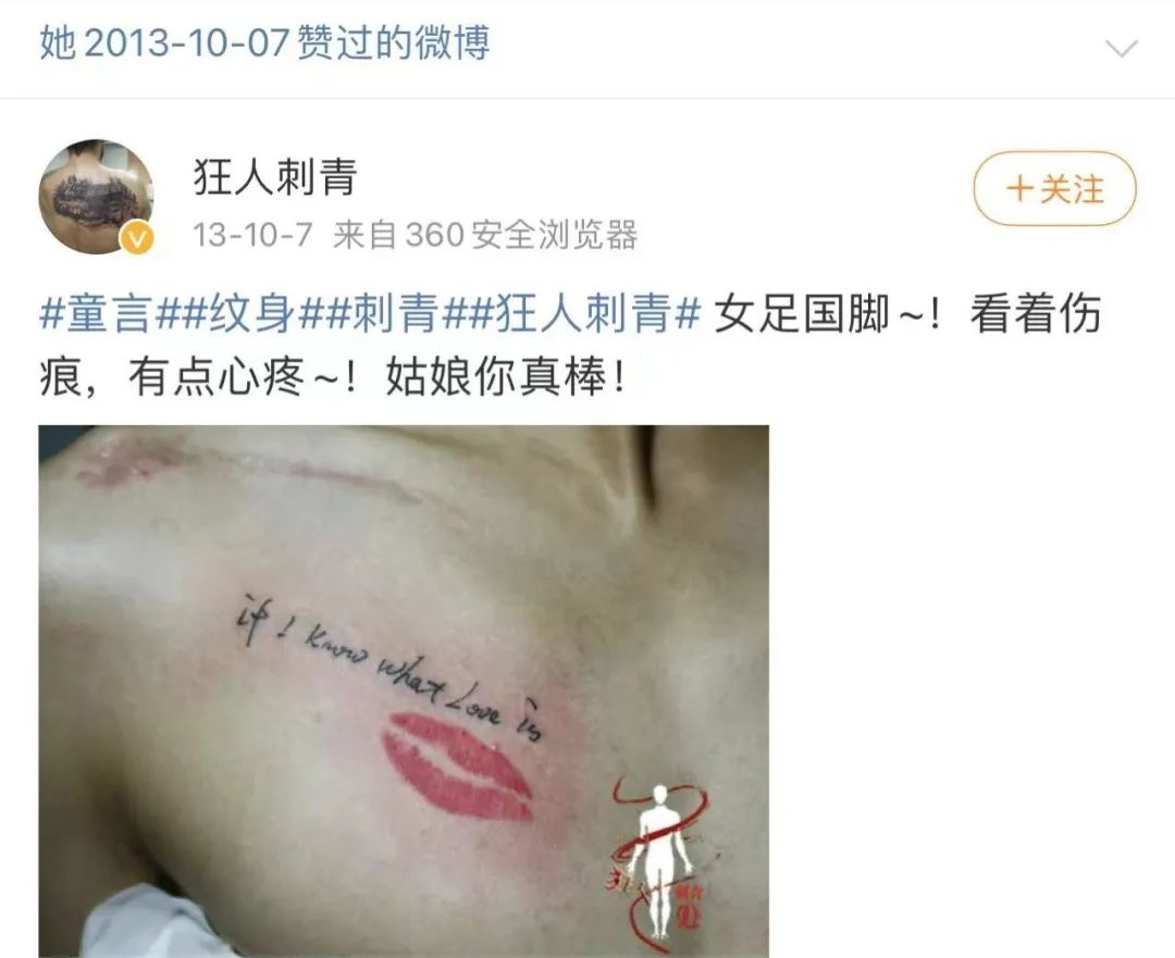 而纹身这个想法,是因为她想纪念战胜伤病、闯过鬼门关的经历。挑选图案时,她看中一个嘴唇亲吻的造型,而纹身师为她纹身时,也不禁心疼起她一身的伤痕。