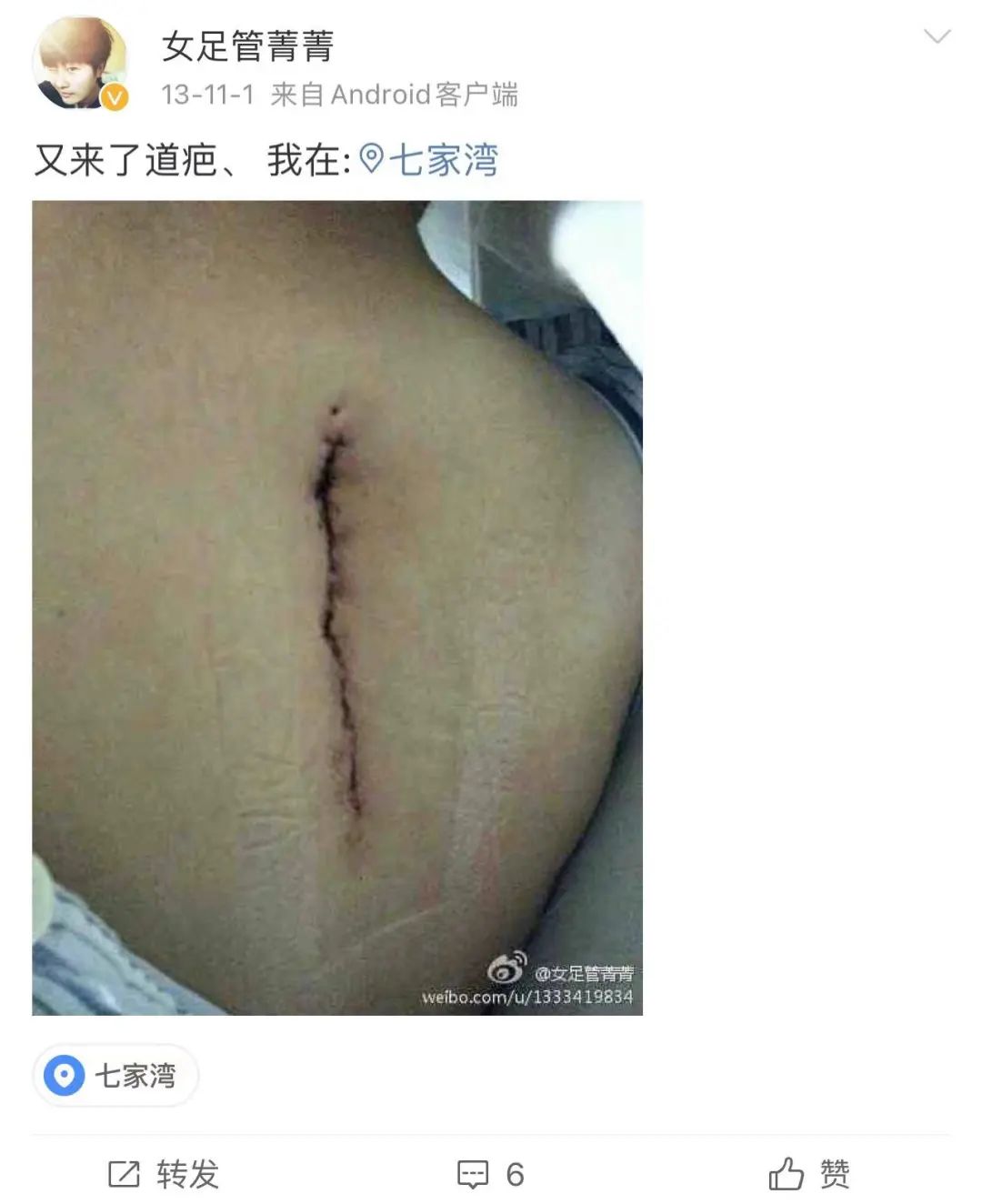 2013年11月1日,管菁菁背上再添新疤,这也是她作为女足职业球员的最后一道疤痕。