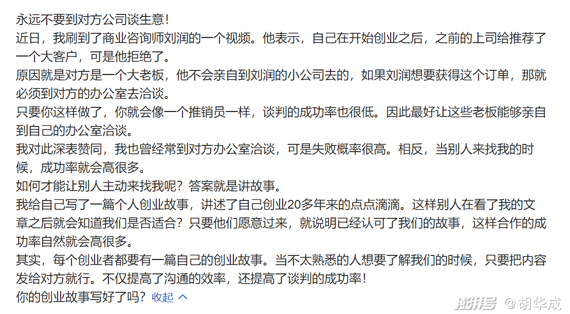 昨天发了一条微头条,引发了网友的争论,我的主要观点是“不要去对方谈业务,这样成功率很低”。