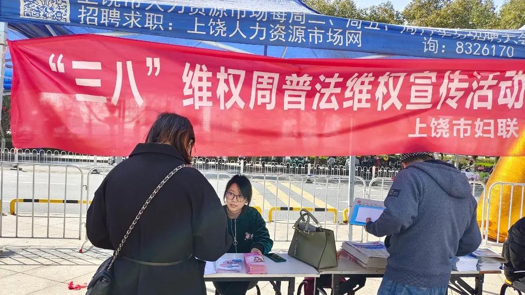 上饶市上饶市妇联在“春风送岗位”招聘现场开展普法维权宣传。广信区妇联组织区、乡镇街道、村居妇联干部和部分村小组妇女小组长、村民共355人在微信群“广信区妇联法律微课堂”参加线上普法宣讲,邀请区法院女法官到月亮湾社区进行普法宣讲,联合上饶市家庭教育协会在旭日街道储溪社区、桥下社区等社区开展《家庭教育促进法》宣讲,共组织线下普法宣讲8场,线上普法4场,发送普法宣传短信20000条。德兴市妇联、市公安局、司法局、法院、检察院等部门联合在市民广场举办德兴2022年“三八”妇女维权周普法维权宣传活动,发放各类宣传资料、宣传品1800余份,吸引1000多名群众参加活动。铅山县妇联联合公安局、检察院、法院、总工会、残联、科协等十家单位在辛弃疾广场开展“建设法治铅山 巾帼在行动”为主题的“三八”维权法治宣传活动。广丰区妇联举行了“幸福婚姻 和谐家庭”专题讲座,联合区司法局、区禁毒办、永丰街道在裕花园小区和锦绣花园开展“三八”维权周普法宣传活动,各镇妇联也开展了法治宣传活动。余干县妇联和余干县司法局在东山大街开展了“三八”维权周普法维权宣传活动。
