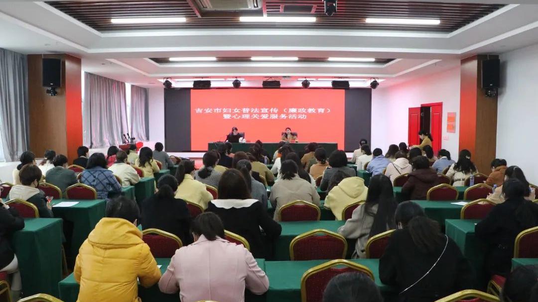 吉安市吉安市妇联在市妇女儿童活动中心开展了吉安市妇女普法宣传(廉政教育)暨心理关爱服务活动,市直机关女性科级干部100余人参加。永新县妇联组织巾帼志愿者们在永新县中心广场开展了“三八”妇女维权周系列活动,表演文艺节目,发放《反家庭暴力法》等宣传材料,摆放宣传展板,向妇女群众宣传法律知识。吉水县妇联联合公检法司等单位巾帼志愿者开展了建设法治中国 巾帼在行动——“三八”维权宣传周集中宣传活动,通过悬挂横幅、设立宣传展板、发放宣传资料等方式,大力宣传妇女儿童权益保障相关法律法规。井冈山市妇联联合政法委、法院、司法局、红星街道办在湘州路社区、工业园区开展普法宣传和法律咨询活动。